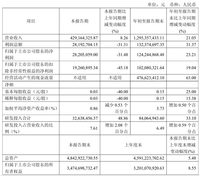 2025 年第三季度,公司实现营业收入 4.29 亿元,较上年同期的 3.97 亿元增长 8.26%;归属于上市公司股东的净利润为 2820.51 万元,较上年同期的 4116.84 万元下降 31.48%;归属于上市公司股东的扣除非经常性损益的净利润为 1926.09 万元,较上年同期的 3513.36 万元下降 45.18%。