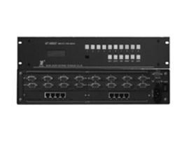 本产品为双绞线矩阵切换器,用于计算机图像信号的切换。其输入接口为D-HD15(VGA)接口,输出端为RJ45头。采用液晶屏显示操作和切换状态。使用面板开关可对矩阵进行切换操作,也可通过随机配备的控制软件,通过RS-232通信方式控制矩阵切换。本机有RS-232输入接口、输出接口,便于多机连接,通过设置设备地址,达到分址控制。设备地址范围是0-255。因此,最多可控制256台设备。本矩阵需与双绞线发送器配合使用。