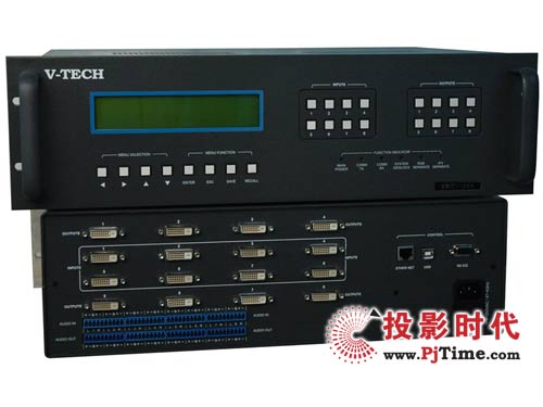 V-TECH新产品VMDVI88A型矩阵切换器采用最新技术,真正的全数字切换,无模拟数字转换的损失。VMDVI88A可以切换8路不同主机的DVI视频\音频源,任意输出到8台数字显示设备。