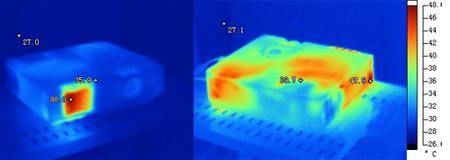高亮度灯泡都会带来高热量,作为便携机型的P813为了保证散热,排风风扇噪声稍微有些大,基本符合30分贝的标称值,在经济模式下噪声会小一些,通过红外热成像,我们可以看到它的散热效率较高,机身温度控制在合理的范围之内。