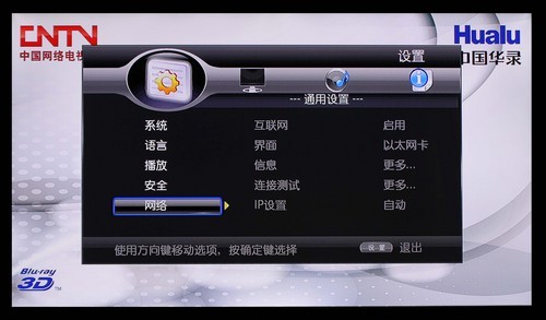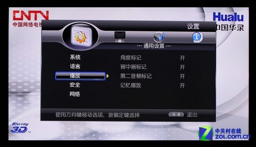 从上面的实拍图中我们可以看到华录BDP2039播放机具备系统、语音、播放、安全以及网络五大项菜单设定,并且每一项菜单下还有不少的子菜单可供用户选择,例如网路连接、图像清晰度调试、中英文输入等,丰富的菜单选项为用户的日常使用提供了非常多的帮助。