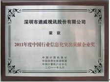 近日,由中国信息化推进联盟、中国计算机行业协会、中国计算机报社等国家信息化领域权威机构和权威媒体共同组织开展的“2011年度中国行业信息化奖项评选”活动结果正式揭晓,80余个企业、个人、产品和解决方案共获得100余项奖项。深圳市迪威视讯股份有限公司凭借优质的产品和优异的服务,荣获2011年度中国行业信息化突出贡献企业奖。 …详情>>